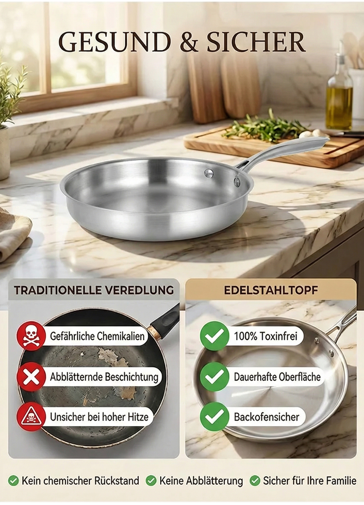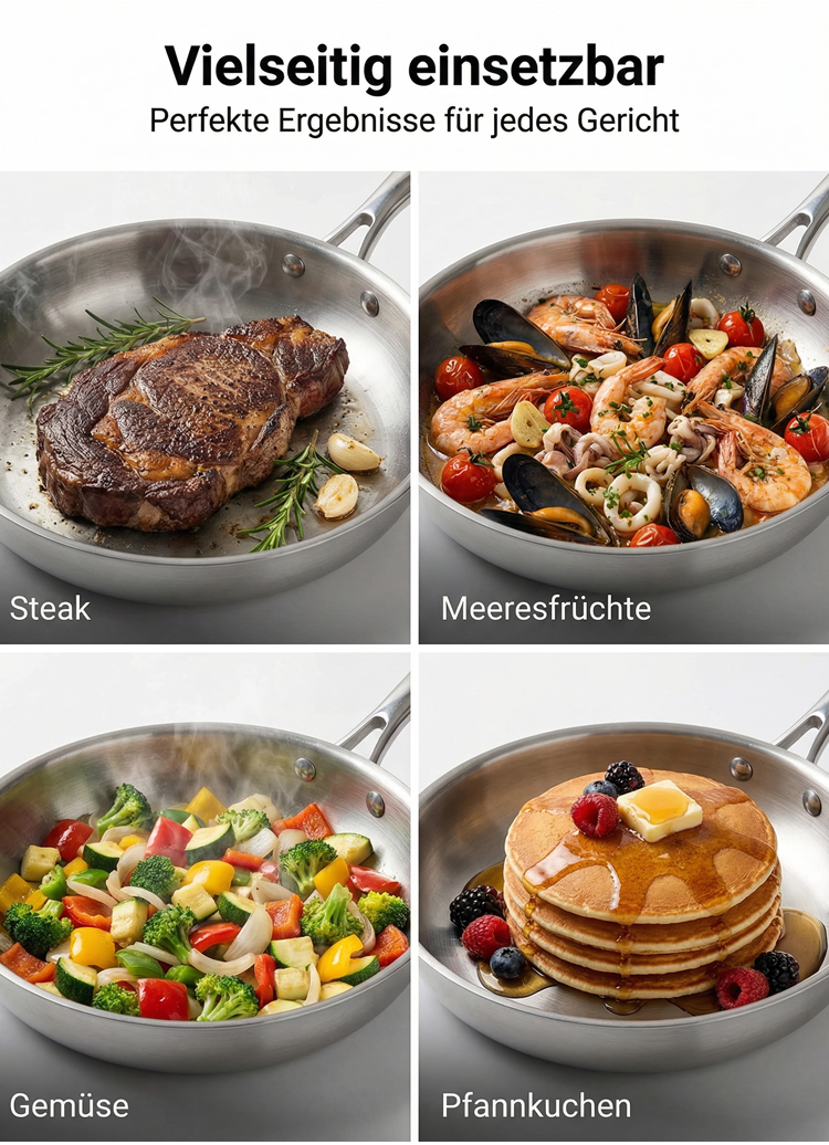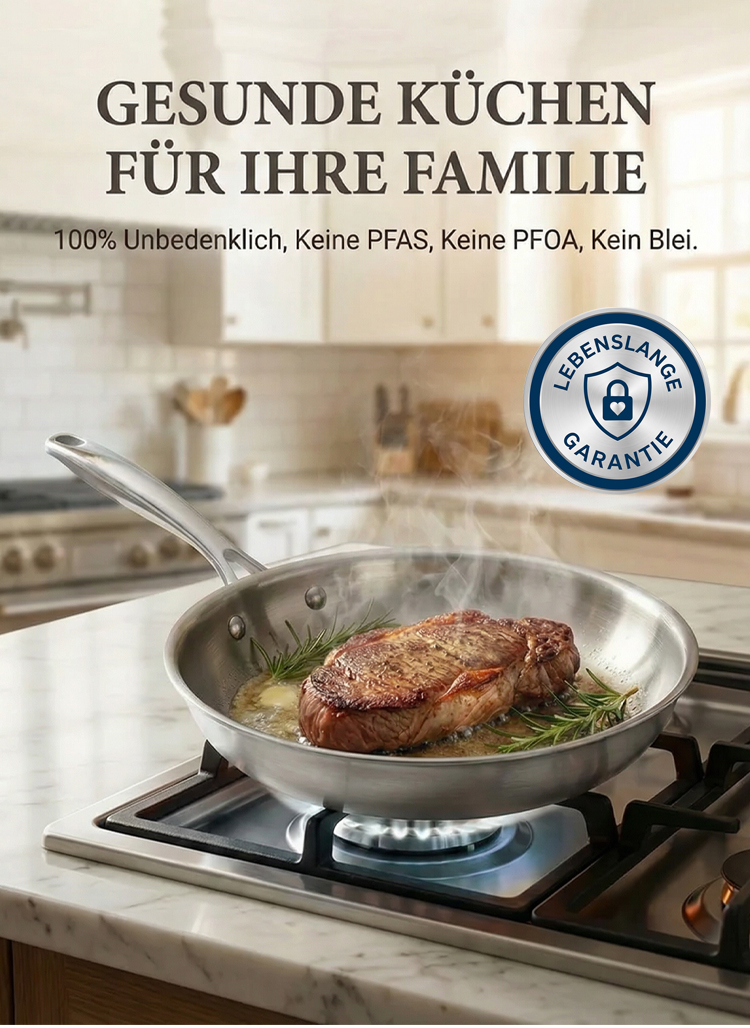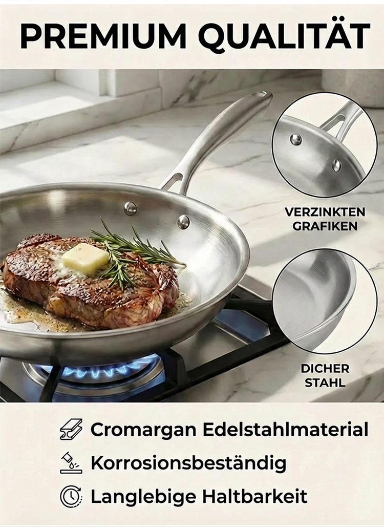 Edelstahl-Bratpfanne ohne Beschichtung | 18/10 Chirurgenstahl | Null Giftstoffe, PFOA-frei | Physikalische Anti-Haft-Wirkung, langlebig & robust 🍳